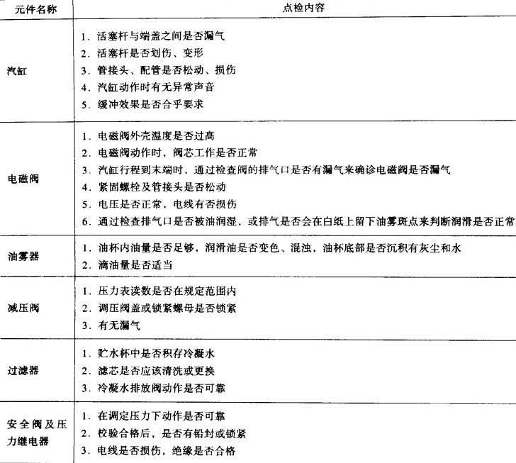 (2)氣動(dòng)元件的定檢。主要內(nèi)容是徹底處理系統(tǒng)的漏氣現(xiàn)象。例如,更換密封元件,處理管接頭或連接螺釘松動(dòng)等,定期檢驗(yàn)測(cè)量?jī)x表、安全閥和壓力繼電器等。氣動(dòng)元件的定檢如表所示
