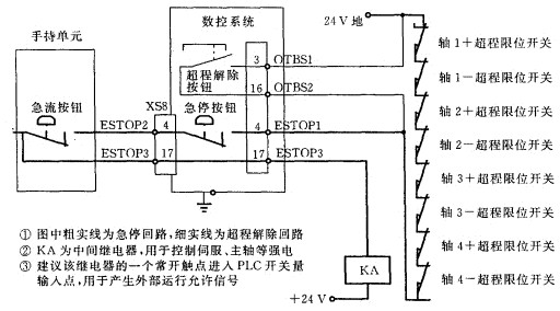 在數(shù)控系統(tǒng)的操作面板和手持單元上均設(shè)有急停按鈕,用于數(shù)控系統(tǒng)或數(shù)控沖床出現(xiàn)緊忽情況時(shí),需要使數(shù)控沖床立即停止運(yùn)動(dòng)或切斷動(dòng)力裝置(如伺服驅(qū)動(dòng)器等)的主電源。當(dāng)數(shù)控系統(tǒng)出現(xiàn)自動(dòng)報(bào)警信息后,需按下急停按鈕,待查看報(bào)警信息并排除故障后,再松開(kāi)急停按鈕,使數(shù)控系統(tǒng)復(fù)位并恢復(fù)正常。該急停按鈕及相關(guān)電路所控制的中間繼電器(KA)的一個(gè)常開(kāi)觸點(diǎn)應(yīng)該接人數(shù)控裝置的開(kāi)關(guān)量輸入接口,以便為數(shù)控系統(tǒng)提供復(fù)位信號(hào)。