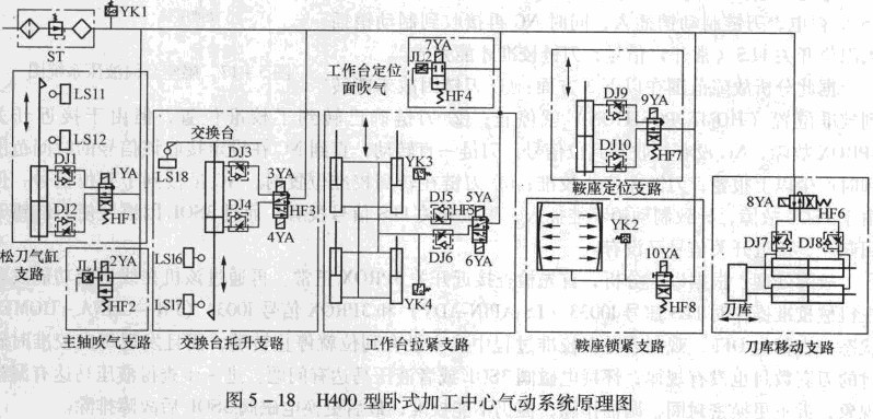 如圖5 -18所示,由于H400加王中心要進(jìn)行雙工作臺的交換,為了節(jié)約變換時(shí)間,保證交換的可靠,工作臺與鞍座之間必須具有能夠快速、可靠的定位、夾緊及迅速脫離的功能??山粨Q的工作臺固定于鞍座上,由4個(gè)帶定位錐的氣缸夾緊,為了達(dá)到拉力大于12000N的可靠工作要求,以及受位置結(jié)柏的限制,該氣缸采用了彈簧增力結(jié)構(gòu),在氣缸內(nèi)徑僅為ct>63mm的情況下就達(dá)到了設(shè)計(jì)拉力要求。例如,數(shù)控沖床氣動(dòng)系統(tǒng)原理圖5二18所示,該支路采用兩位雙電控電磁閥HF5進(jìn)行控制,當(dāng)雙工作臺交換將要進(jìn)行或已經(jīng)進(jìn)行完畢時(shí),數(shù)控系統(tǒng)通過PMC控制電磁閥HF5,使線圈5YA或6YA得電,分別控制氣缸活塞的上升或下降,通過鋼珠拉 套機(jī)構(gòu)放松或拉緊工作臺上的拉釘,完成鞍座與工作臺之間的放松或夾緊。為了避免活塞運(yùn)動(dòng)時(shí)的沖擊,在該支路采用具有得電動(dòng)作、失電不動(dòng)作、雙線圈同時(shí)得電不動(dòng)作特點(diǎn)的兩位雙電控電磁|詡HF5進(jìn)行控制,可避免在動(dòng)作進(jìn)行過程中突然斷電造成的機(jī)械部件沖擊損傷。采用單向節(jié)流閥DJ5、DJ6來調(diào)節(jié)夾緊的速度,避免較大的沖擊載荷。該位置由于受結(jié)構(gòu)限制,用感應(yīng)開關(guān)檢測放松與拉緊信號較為困難,故采用可調(diào)工作點(diǎn)的壓力繼電器YK3、YK4檢測壓力信號,并以此信號作為氣缸的到位信號。