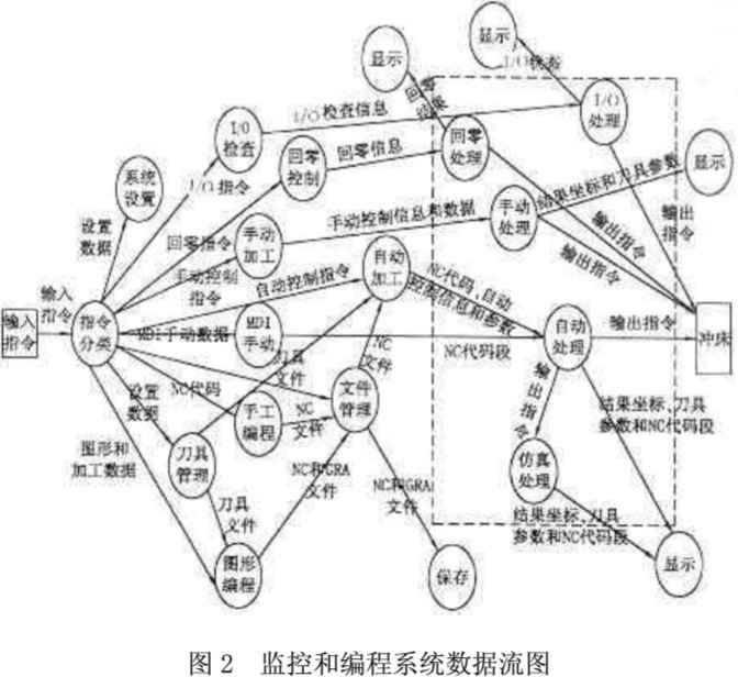 數(shù)控沖床監(jiān)控和編程系統(tǒng)的數(shù)據(jù)流圖如圖2所示,其中虛線方框內(nèi)的手動處理、I/O處理、自動處理、仿真處理和回零處理等過程由控制機(jī)完成,其數(shù)據(jù)詞典分類如下: