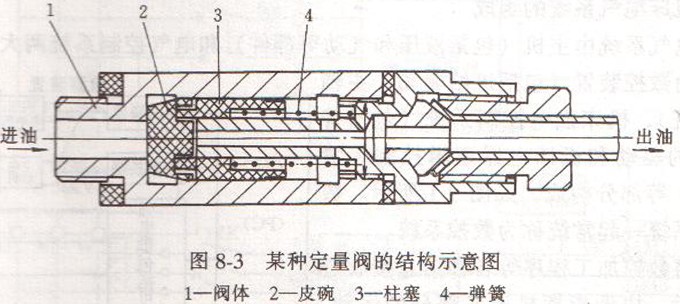 圖8-3是定量閥的結(jié)構(gòu)示意圖。定量閥的工作原理是:當油泵工作時壓力油進入油口后,將皮碗壓緊閥芯的出油口之后,同時克服彈簧的彈力,使柱塞向右運動,壓力油進入定量閥的左腔;當油泵不工作時,在彈簧的作用下,柱塞左移,左腔中的潤滑油使皮碗關(guān)閉進油口,打開閥芯上的出油口,定量的潤滑油輸出。