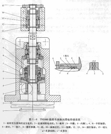 圖3 -6所示為T(mén)ND360數(shù)控沖床縱向滑板的傳動(dòng)系統(tǒng)圈。由縱向直流伺服電動(dòng)機(jī),經(jīng)安全聯(lián)軸器直接驅(qū)動(dòng)滾珠絲杠螺母副,傳動(dòng)縱向消板,使其沿床身上的縱向?qū)к夁\(yùn)動(dòng),直流伺服電動(dòng)機(jī)由尾部的旋轉(zhuǎn)變壓器和測(cè)速發(fā)電機(jī)進(jìn)行位置反饋和速度反饋,縱向進(jìn)給的最小脈沖當(dāng)量是0.001mm。這樣構(gòu)成的伺服系統(tǒng)為半閉環(huán)伺服系統(tǒng)。