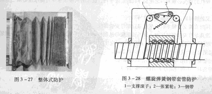 圖3 -28中防護(hù)裝置和蝶母一起固定在拖板上,整個裝置由支承滾子1、張緊輪2和鋼帶3等零件組成。鋼帶的兩端分別固定在絲杠的外圓表面。防護(hù)裝置中的鋼帶繞過支承滾子,并靠彈簧和張緊輪將鋼帶張緊。當(dāng)絲杠旋轉(zhuǎn)時,工作臺(或拖板)相對絲杠作軸向移動,絲杠一端的鋼帶按絲杠的螺距被放開,而另一端則以同樣的螺距將鋼帶纏卷在絲杠上。由于鋼帶的寬度正好等于絲杠的螺距,因此蝶紋槽被嚴(yán)密地封住。還因為鋼帶的正反面始終不接觸,鋼帶外表團蒙古附的臟物就不會被帶到內(nèi)表面去,使內(nèi)表面保持清潔。這是其他防護(hù)裝置很難做到的。