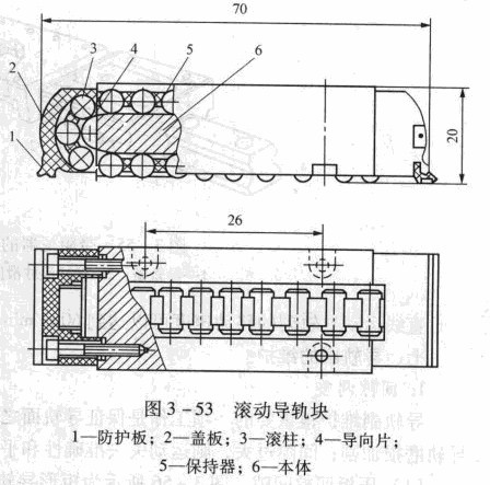 圖3 -54所示為TBA- UU型直線滾動導軌(標準塊)。它由4列滾珠組成,分別配置在導軌的兩個肩部,可以承受任意方向(上、下、左、右)相比較,后者可承受顛覆力矩和側向力。