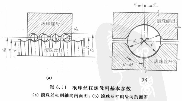 此外還有絲杠螺紋大徑d、絲杠蝶、紋小徑dl、螺紋全長(zhǎng)i、滾珠直徑db、螺母螺紋大徑D、螺母螺紋小徑隊(duì)、滾道圓弧偏心距e以及滾道圓弧半徑R等參數(shù)。
