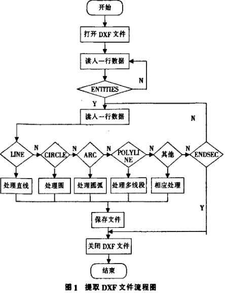 數(shù)控沖床在編制程序時需要的只是圖形的幾何信息,而DXF文件中的ENIITIES段保存了圖形圖像的所有幾何信息,因此只要編寫ENTITIES段就可完成DXF文件的準(zhǔn)確輸出,其余段可忽略。在讀取DXF文件時只需要提取直線的兩個端點(diǎn).圓弧的圓心坐標(biāo)、半徑、起始角、終止角,圓的圓心坐標(biāo)、半徑,矩形的4個頂點(diǎn)等。DXF文件數(shù)據(jù)讀取和處理流程圖見圖t。