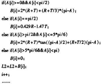 折彎部分伸長量與板科的厚度r、折彎角A、折彎半徑R等因素有關(guān)。板料厚度r和折彎半徑尺由外部輸入?yún)?shù)得到,折彎角^通過計算鏈表p2中各相鄰直線的夾角獲得,并將各種夾角的值放在教組A中,得到每個折夸處的伸長量放在數(shù)組B中。可以根據(jù)公式分別進(jìn)行計算: