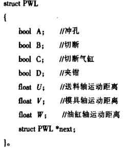 通過讀取DXF文件,可以得到要加工的孔中心相對于原點(diǎn)的坐標(biāo),并根據(jù)孔的類型和大小選擇模具型號,根據(jù)要加工孔的位置和自動選擇的模具號碼,來確定送料軸、模具軸和油缸軸的運(yùn)動距離。我們建立如下結(jié)構(gòu)來保存加工代碼: