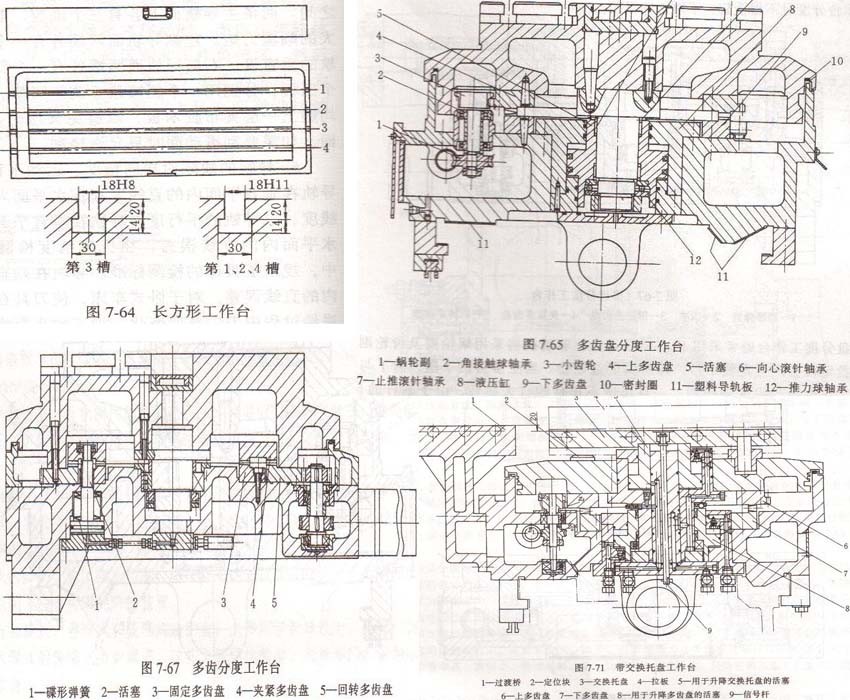 3、帶交換托盤的多齒分度工作臺(tái)為了提高加工中心的運(yùn)轉(zhuǎn)率,在加工中心前面(或側(cè)面),設(shè)置二面或多面交換托盤,通過托盤自動(dòng)交換裝置,與主機(jī)進(jìn)行托盤交換。圖7-71所示為帶交換托盤的多齒分度工作臺(tái)結(jié)構(gòu)。